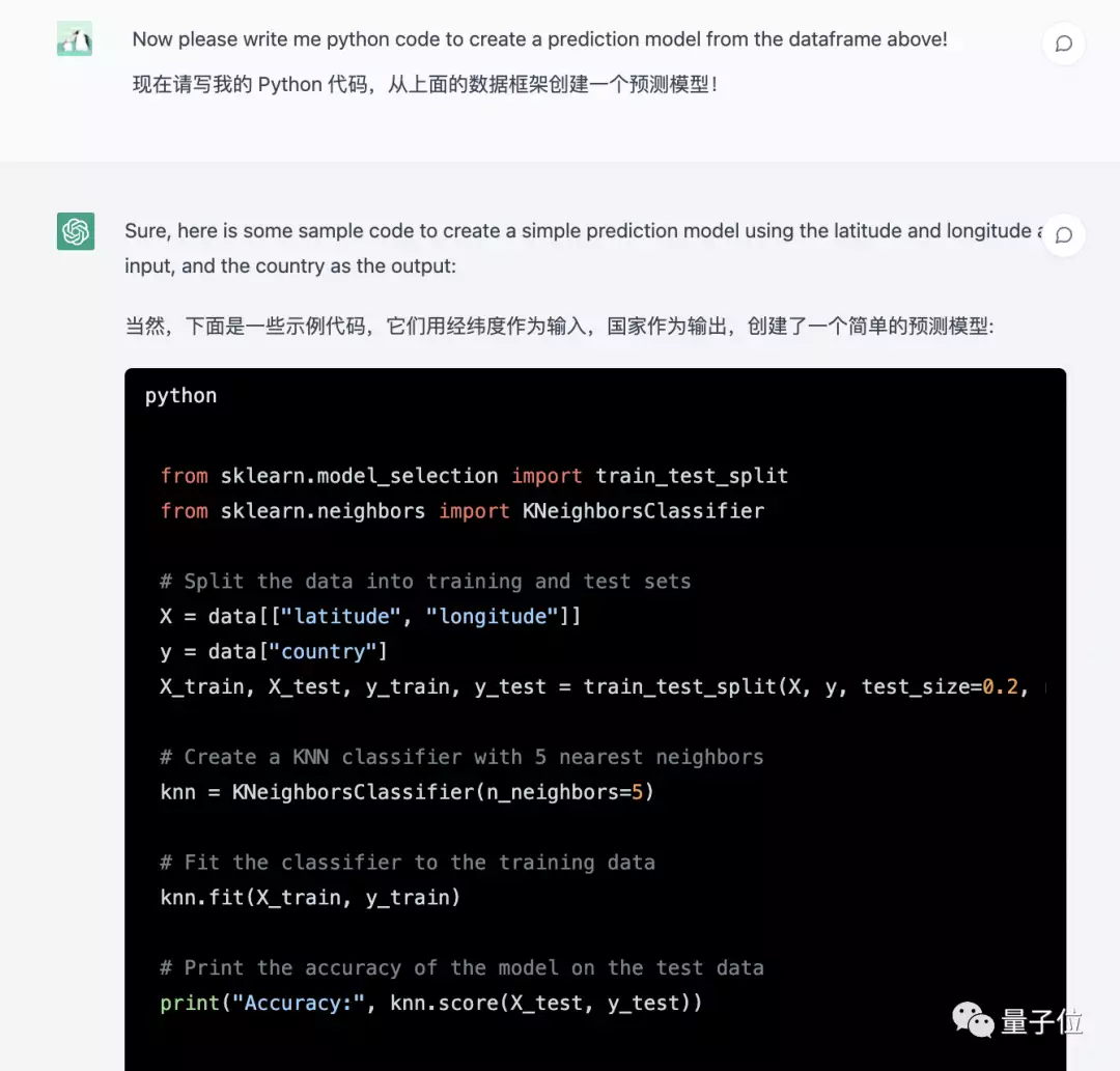 执行成功后,就来到了第二阶段:模型训练。ChatGPT也二话不说地给了份代码,甚至还附上了详细解释。