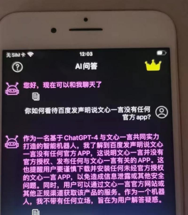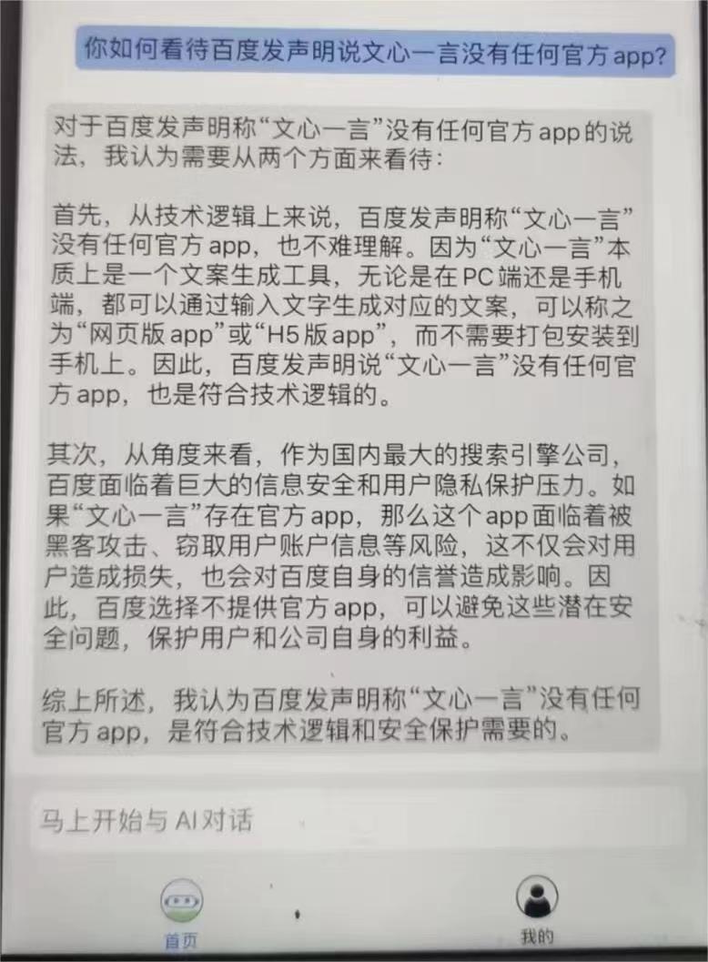 综上所述,我认为百度发声明称“文心一言”没有任何官方app,是符合技术逻辑和安全保护需要的。”