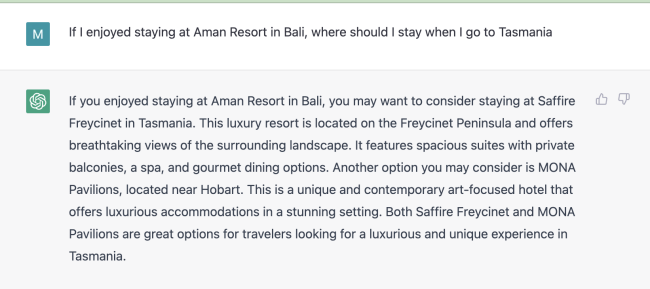 这个答案看起来并不特别,但它体现了类比能力。ChatGPT首先需要了解安缦酒店的定位和风格,之后才能提供同类酒店的推荐。