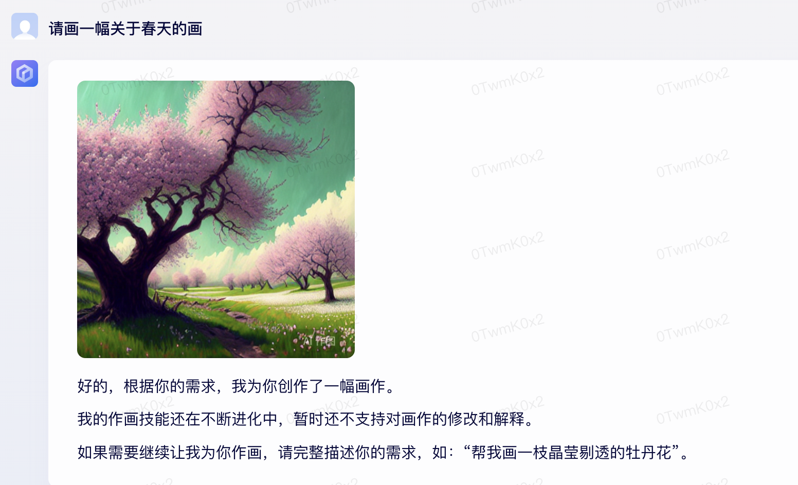 首先,我们让她给我们创作一幅春天的画,没有明确具体是什么,只代表春天就可以了。我们可以看到,文心一言根据春天万花盛开的特点,画出这么一幅画,我个人认为质量很高。