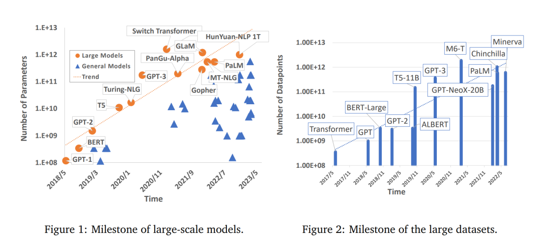 大型模型的部署也成为最重要的研究领域之一。例如,Dehghani等人[44]提出了ViT-22B,该模型展示了计算机视觉(CV)社区中「类LLM(大型语言模型)」扩展的潜力。GPT-1[196]提出了有监督微调以0.1B参数驱动语言模型。而两年后,GPT-3[18]在45TB数据样本上训练了175B参数,并在各种自然语言处理任务上成功取得了最先进的结果。Turing-NLG采用了大约172亿个参数的生成语言模型,只需一年时间就可以快速迭代到具有530B参数的规模较大的模型MT-NLG[229],这在几个任务中远远领先于GPT-3。