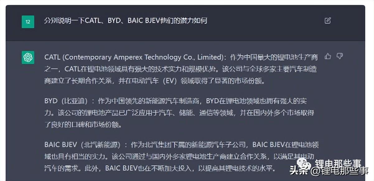 ChatGPT:CATL (Contemporary Amperex Technology Co., Limited):作为中国最大的锂电池生产商之一,CATL在锂电池领域具有强大的技术实力和规模优势。该公司与全球多家主要汽车制造商建立了长期合作关系,并在电动汽车(EV)领域取得了显著的市场份额。