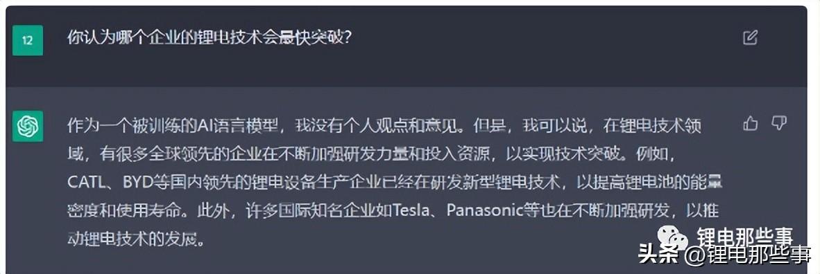 ChatGPT:但是,我可以说,在锂电技术领域,有很多全球领先的企业在不断加强研发力量和投入资源,以实现技术突破。例如,CATL、BYD等国内领先的锂电设备生产企业已经在研发新型锂电技术,以提高锂电池的能量密度和使用寿命。此外,许多国际知名企业如Tesla、Panasonic等也在不断加强研发,以推动锂电技术的发展。