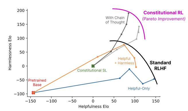 Claude 和 ChatGPT 都依赖于强化学习(RL)来训练偏好(preference)模型。CAI(Constitutional AI)也是建立在RLHF的基础之上,不同之处在于,CAI的排序过程使用模型(而非人类)对所有生成的输出结果提供一个初始排序结果。