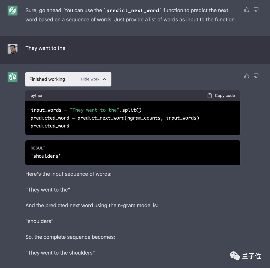 具体来说,就是给出一半的句子,让AI预测下一个词,ChatGPT很快给出了代码: