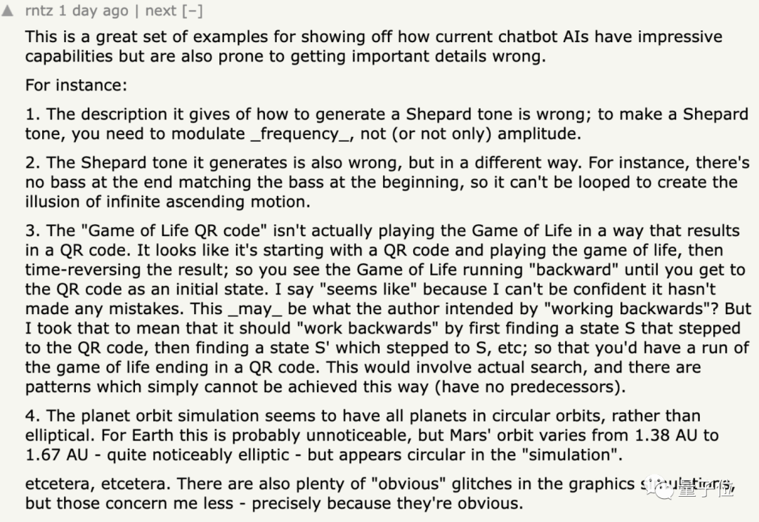 生成谢泼德音调的方法是错误的,不仅得调振幅,还得调频;生成的谢泼德音调本身也有问题,正常来说最后一个音应该与第一个音相同,使得循环可以无限期地继续;用细胞自动机生成二维码图像,其实是反过来用二维码图像倒推出细胞自动机(不过,这里作者也承认他“教”ChatGPT作弊了)行星轨道模拟中的轨道都是圆形轨道,从科学角度来说应该是很明显的椭圆形。图形生成其实也有小bug,不一一列举。