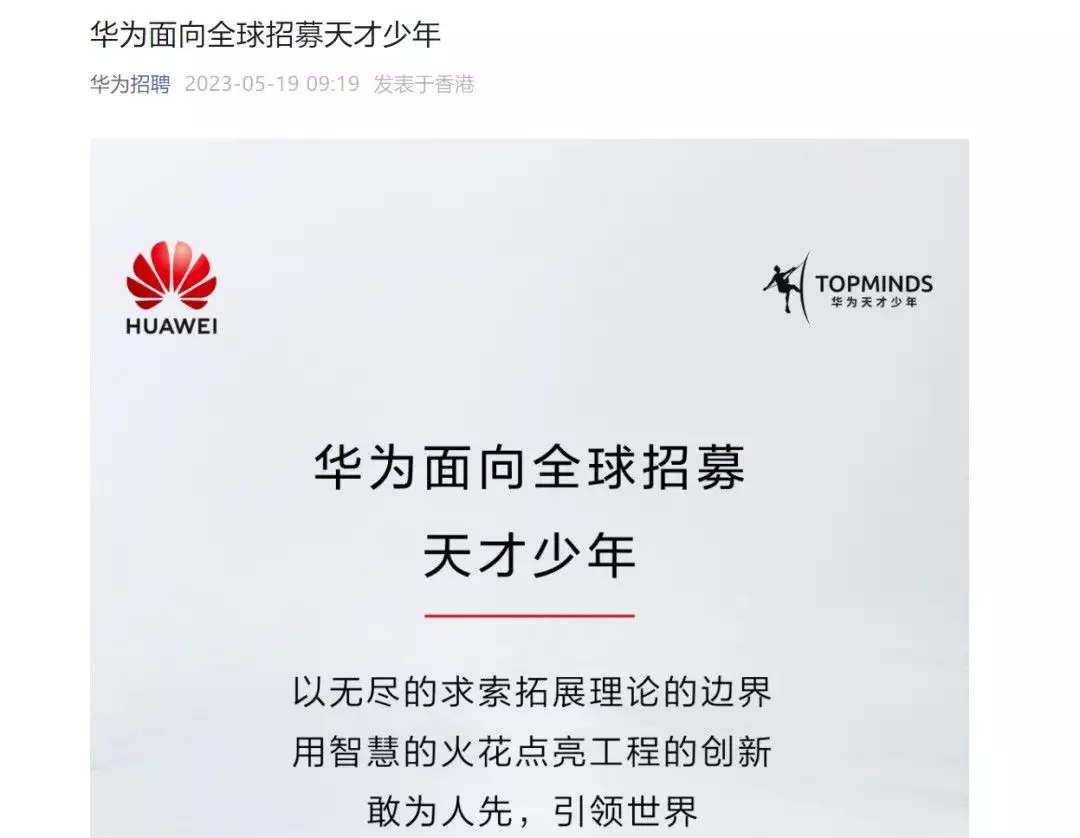 🌟华为🔥再次启招”科技奇才”!🚀寻找全球顶尖青年,不限学历与院校背景,只要在数学、物理、化学等尖端科学,或是计算机、智能制造等领域展现出卓越才能和领导潜力。华为承诺,将为你提供业界领先的薪资待遇,是常规的5倍不止!🏆成为技术革新者,一起书写未来篇章!🌍欲了解更多详情,敬请关注华为官网更新。👩‍💻👨‍🎓 #天才少年 #华为招聘 #科技领军人物
