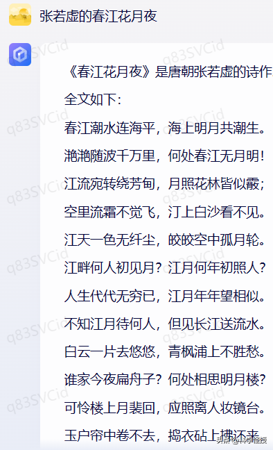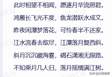 四、试一下同时来两句“江流宛转绕芳甸,月照花林皆似霰;空里流霜不觉飞,汀上白沙看不见。”