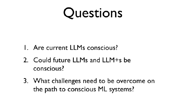 我的问题将是:首先,目前的LLM是否具有意识?第二,未来的LLM及LLM+是否可能具有意识?第三,实现具有意识的机器学习系统需要克服哪些挑战?尽管存在挑战和反对意见,但我认为这是一个建设性的项目,并且最终可能会为实现AI系统中的意识提供潜在的指南。