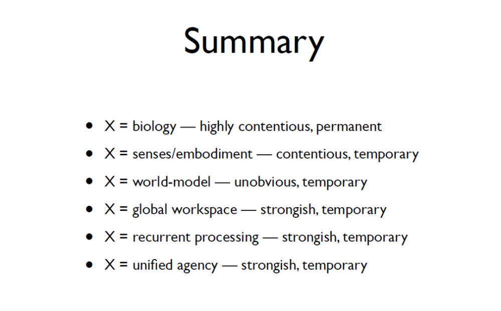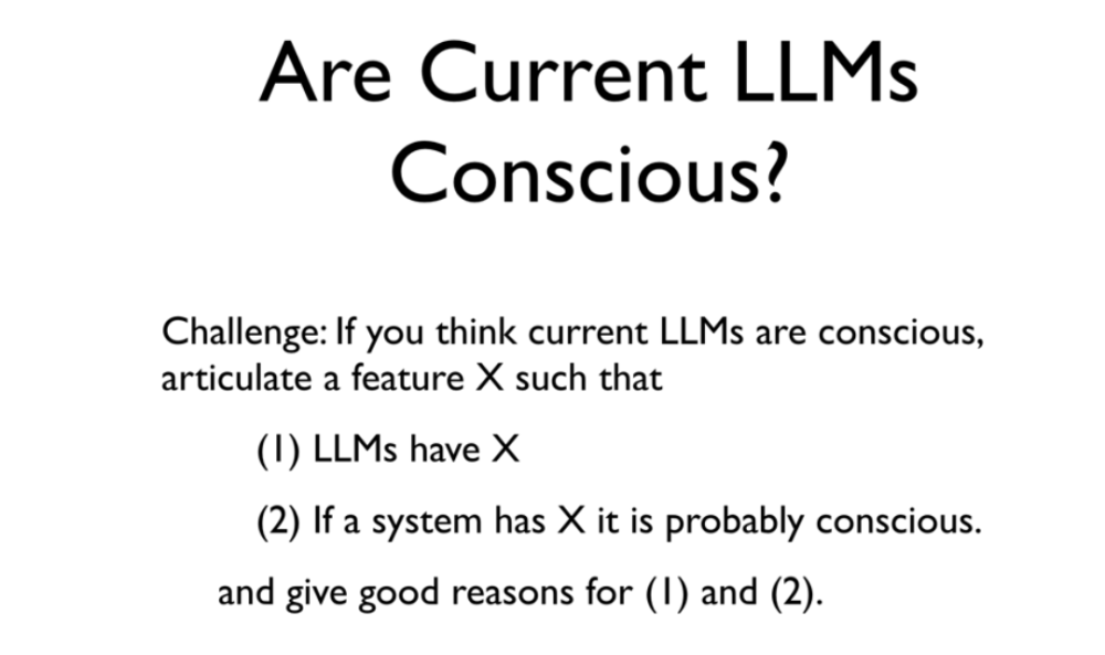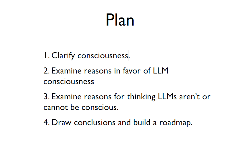 我对意识有很多看法,但今天我会尽量不去假设太多。例如,对于接下来的大部分内容,我不需要假设存在意识方面的难问题(hard problem)。我推测过泛心论(panpsychism),即万物皆有意识的观点。如果你假设一切都是有意识的,那么你就有了一条通往有意识的大型语言模型的非常简单的道路。所以我不会在这里假设泛心论是对的。我会在这里提出自己的观点,但我主要会尝试从科学和意识哲学中相对主流的共识观点出发,思考LLM及其后继者的后续发展。