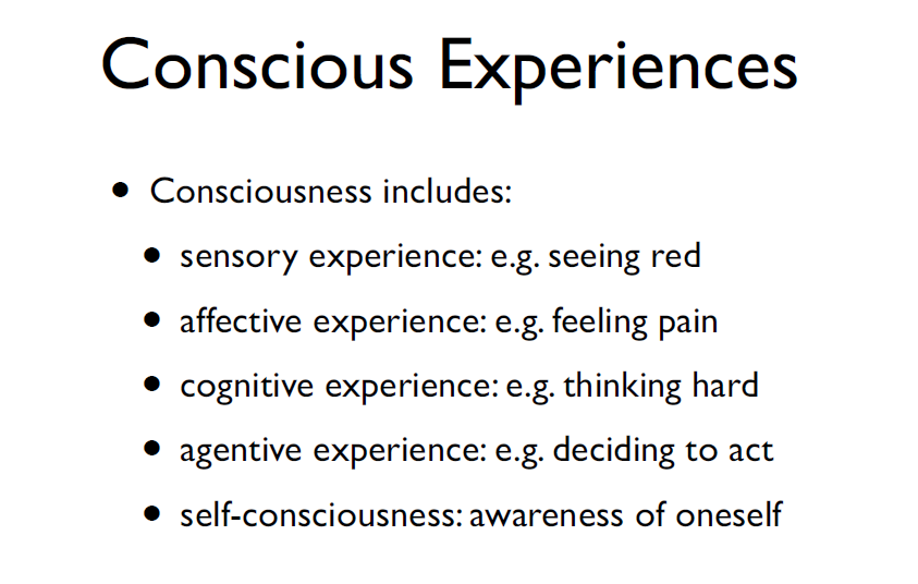意识有许多不同的维度。有与知觉相关的感官体验,比如看到红色。有与感觉和情绪相关的情感体验,比如感觉疼痛。有与思想和推理相关的认知体验,比如认真思考一个问题。有与行动相关的代理体验,比如决定采取行动。还有自我意识和自我注意。它们中的每一个都是意识的一部分,尽管它们都不是意识的全部。这些都是主观体验的维度或组成部分。