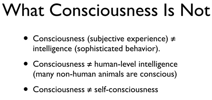 首先让我们看看意识。在这次演讲的标题里,我本来用的是「感知」(sentience)一词。最后我认为这个词太模糊而且令人困惑,甚至比「意识」(consciousness)一词还要更加令人困惑。