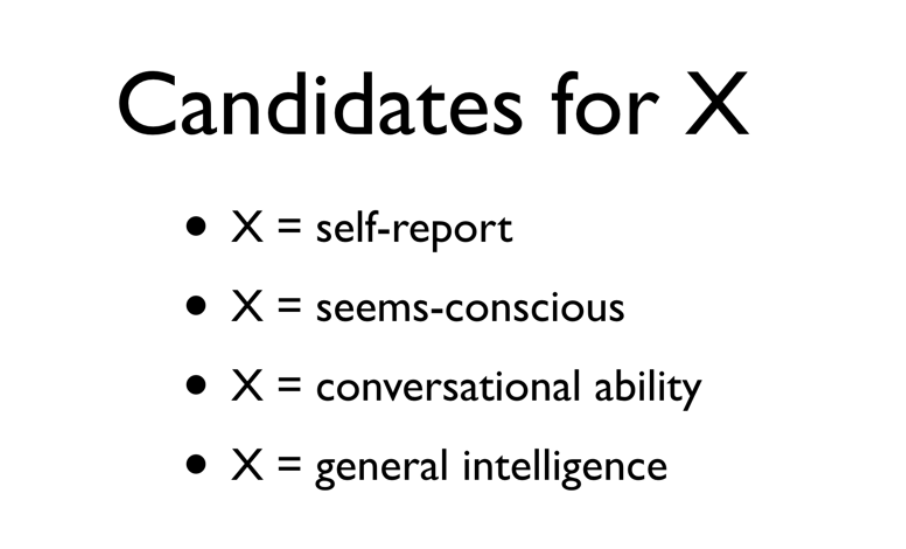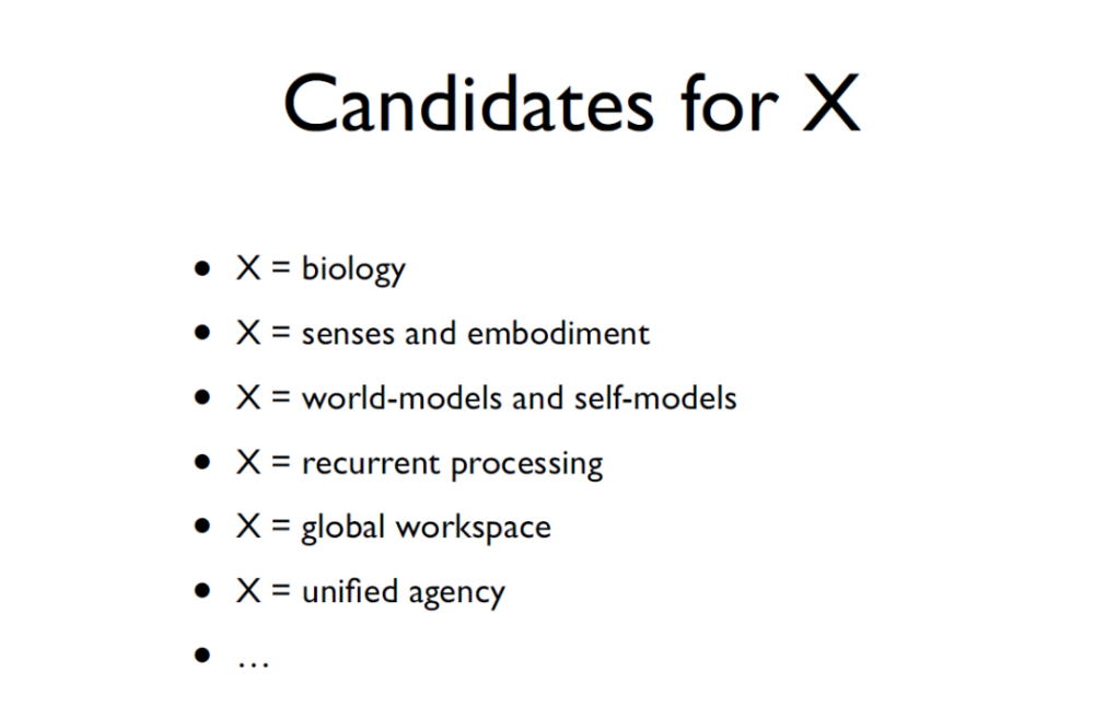 作为X的第二个候选者,其建立在这一事实之上,即某些语言模型对某些人来说似乎是有感知能力的。我不认为这很重要。我们从发展心理学和社会心理学中了解到,人们经常将意识归因到不存在的地方。在AI中,即使是像Eliza这样的简单系统,我们也会发现这一点。在心理学中,人们发现任何有眼睛的系统,都特别容易被认为是有意识的。所以我不认为这种反应是有力的证据。真正重要的是促使这种反应的系统行为。