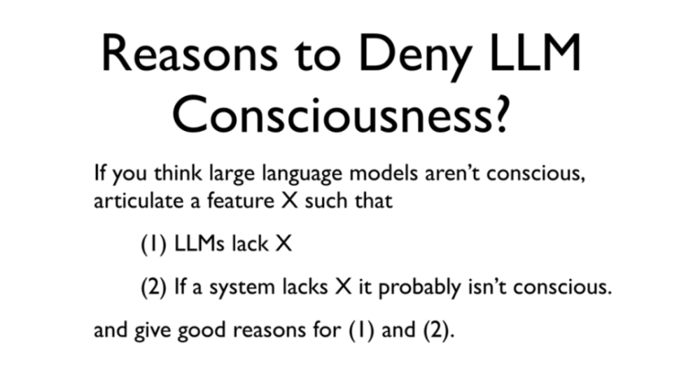 我将以类似的形式要求提供反对LLM意识的证据。如果您认为大型语言模型没有意识,请阐明特征X,使得 (i) 这些模型缺少X,(ii) 如果系统缺少X,它可能没有意识,并给出 (i) 和 (ii) 的原因。