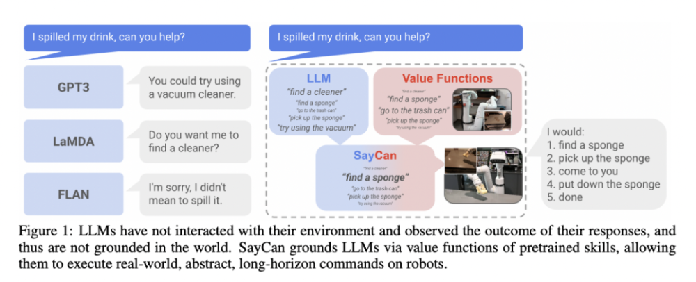 语言动作模型奠基于对物理或虚拟身体的控制。这是谷歌的SayCan,它使用扩展语言模型来帮助控制机器人执行各种功能。