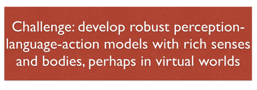 一个突出的问题是感官和身体的作用。很多人观察到,LLM没有感官处理,所以无法感知。同样,它们没有身体,所以它们不能行动。这至少表明,它们没有感官意识和身体意识。一些研究人员认为,在没有感官的情况下,LLM没有真正的意图或认知。在1990年代,Stevan Harnad和其他人认为*,人工智能系统需要奠基(grounding)在某个环境中,才能具有意图、理解力和意识。近年来,许多研究人员认为,感官基础是深刻理解LLM所必需的。