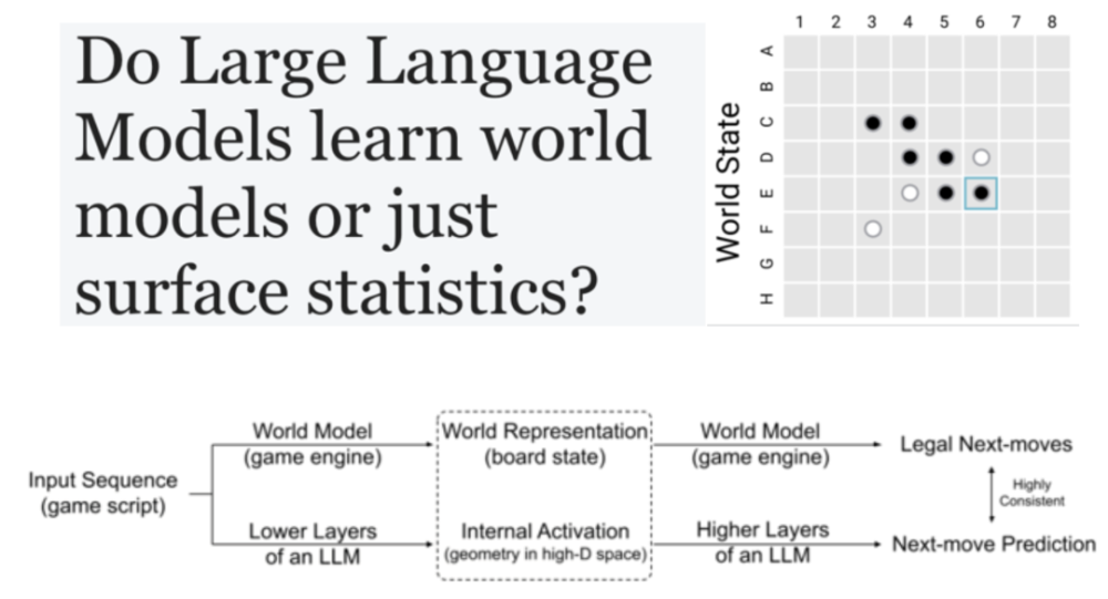 如果这是正确的,那么潜在的问题不是LLM原则上是否可能拥有世界模型和自我模型,而是这些模型是否已经存在于当前的LLM中。这是一个实证问题。我认为这里的证据仍在发展中,但可解释性研究至少提供了一些存在稳健世界模型的证据*。例如,Kenneth Li及其同事训练了一个LLM,该LLM在棋盘游戏奥赛罗中接受了一系列动作的训练,并提供了强有力的证据表明它构建了64个棋盘正方形的内部模型,并使用该模型来确定下一步动作。寻找事实在语言模型中的哪里以及怎样被表征还有很多的工作要做。