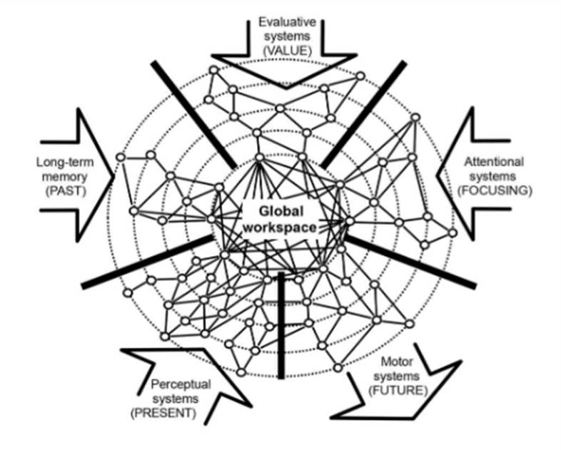 也许认知神经科学中当前领先的意识理论,是由Bernard Baars提出并由Stanislas Dehaene及其同事发展的全局工作空间理论*。该理论认为,意识涉及一个容量有限的全局工作空间:一个用于从众多非意识模块收集信息并使它们能够访问信息的中央信息交换平台。任何进入全局工作空间的东西都是有意识的。
