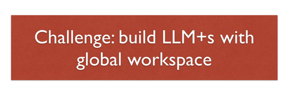 许多人观察到标准语言模型显然没有全局工作空间,但我们可以扩展它们来生成工作空间。已经有越来越多的多模态LLM+相关研究就使用工作空间来协调不同模态。这些系统具有针对图像、声音或文本的输入和输出模块,这可能涉及高维的工作空间。要想把这些模块整合起来,就需要一个低维空间作为接口。模块之间的低维空间接口看起来很像全局工作空间。