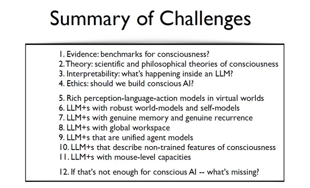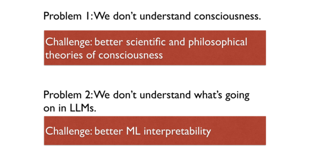 当然这里还有很多我们不明白的地方。一个潜在的问题是我们不了解意识。这是一个难问题(hard problem)。这里的挑战是发展更好的科学和哲学的意识的理论。在过去的三十年里,他们取得了长足的进步,但还需要做更多的工作。第二个主要问题是我们并不真正了解这些大型语言模型中发生了什么。机器学习可解释性中的可解释性项目已经走过了漫长的道路,但还有很长的路要走。因此,我们需要将这两个挑战添加到考虑之中。