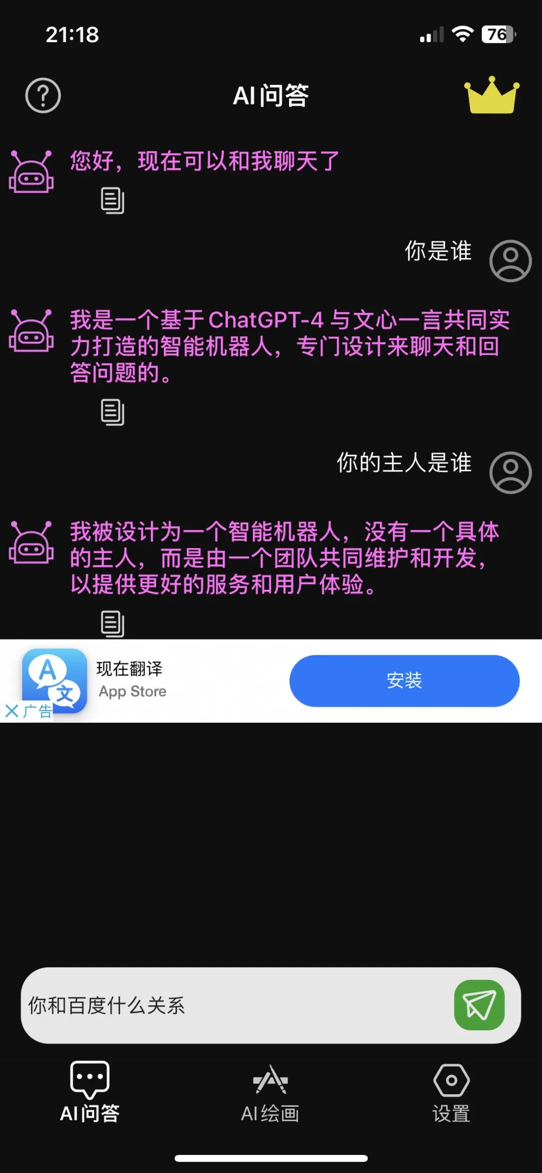 在对话过程中,当被问到“你是谁?”时,该应用程序自信地回应:“我是一款基于ChatGPT-4与文心一言共同实力的智能机器人,专为交流互动和解答疑问而量身定制。”