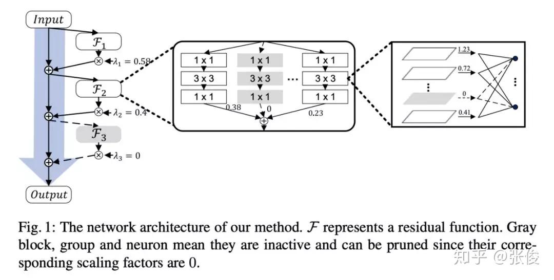 本文是图森发表在 ECCV 2018 的工作,论文在结构稀疏化的基础上提出了一种更简洁的方式,达到粗粒度的剪枝(直接剪枝整个 residual function/aggregated residual block 中的一个 group),通过引入一个结构缩放因子 lambda,在训练过程中对 lambda 施加一个 L1 正则化,训练结束后,剪掉 lambda=0 的块或 group,达成网络剪枝的效果。