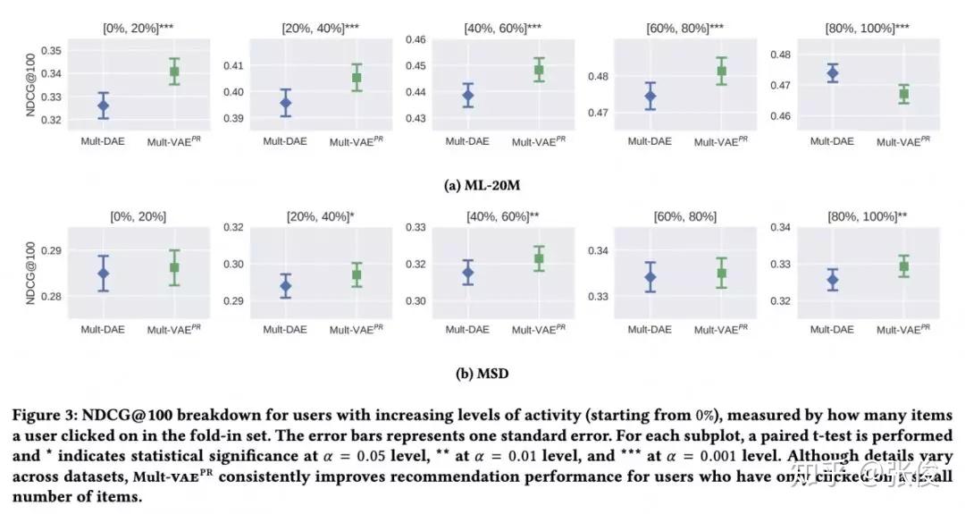 作者基于 VAE 提出了一个生成模型 VAE_CF,并针对 VAE 的正则参数和概率模型选取做了适当调整,使其在当前推荐任务中取得最佳结果。