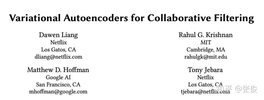 本文是 Netflix、MIT 和 Google AI 发表于 WWW 2018 的工作,论文将变分自编码器(VAE)扩展到协同过滤以进行隐式反馈,通过非线性概率模型克服线性因子模型的局限。其次,作者引入了具有多项式似然(multinomial likelihood)的生成模型,并使用贝叶斯推断进行参数估计。
