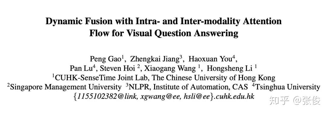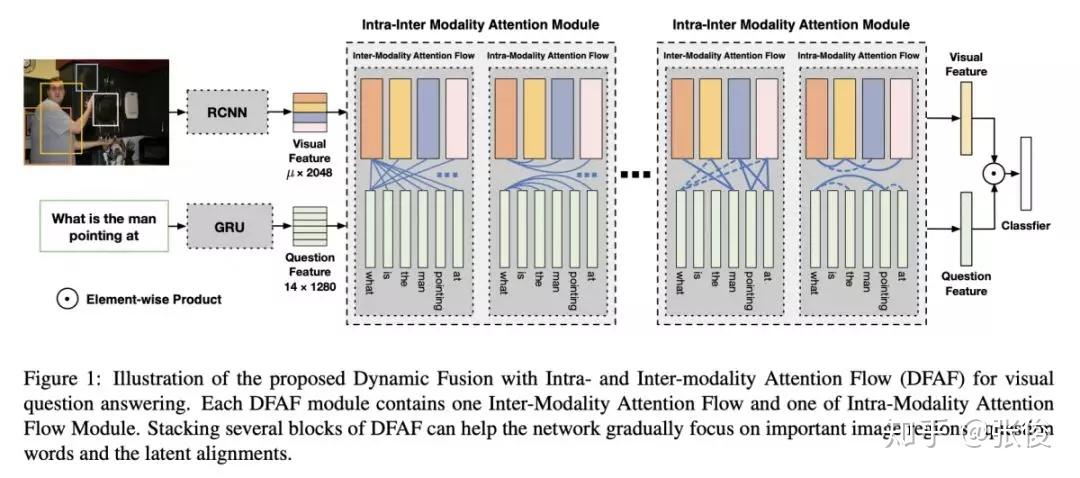 学习多模态之间的高效特征融合是视觉问答问题的核心,本文提出了一种动态融合多模态特征的新方法,通过模态内(intra-modality )和模态间(inter-modality)的信息流,交替地在视觉和语言模态之间传递动态信息。它可以稳健地捕获语言和视觉域之间的高层次语义交互,从而显著提高视觉问答的性能。