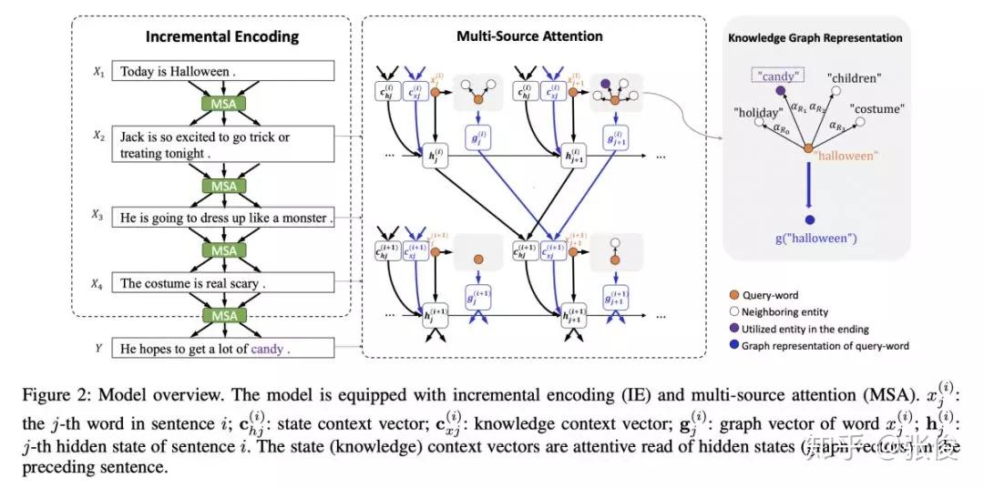 本文是清华大学黄民烈老师组发表于 AAAI 2019 的工作,论文提供了一种如何利用常识知识做故事结尾生成的新思路。作者提出利用增量编码的方式来对 RocStories 数据集中的 context 进行编码,并且将从 ConceptNet 中检索得到的知识进行编码,利用 multi-source attention 的方式融合到 context 的编码过程中。