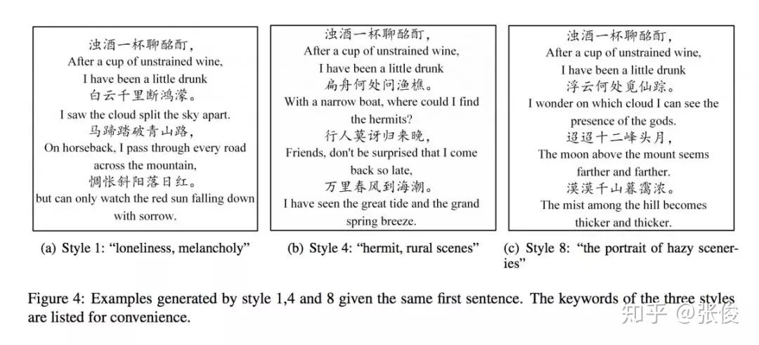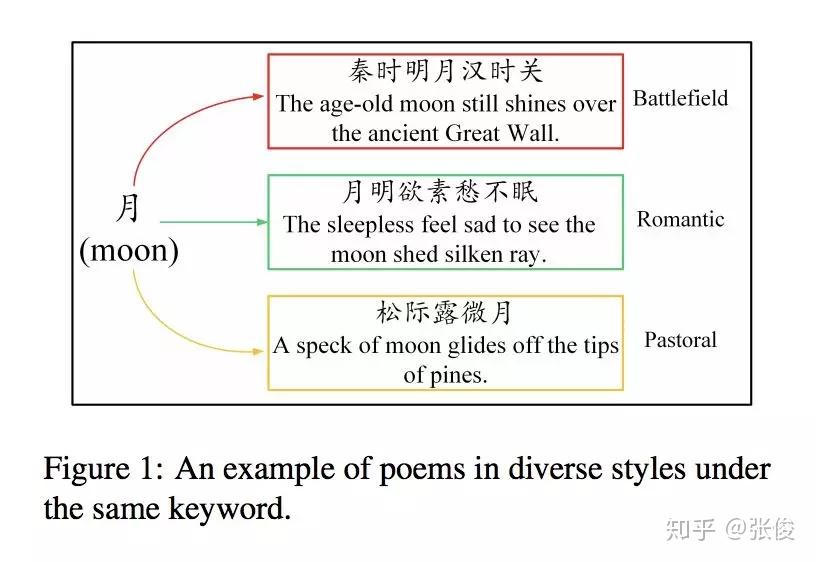 本文是清华大学发表于 EMNLP 2018 的工作。传统的中国古诗生成模型普遍采用机器翻译中的 seq2seq 模型,用上一句的诗句作为输入,预测生成下一句作为输出。但是机器翻译任务和古诗生成任务有很大的不同:机器翻译任务中输入与输出的一一对应关系比较强,如中英翻译中中文出现了“苹果”一词则英文翻译中就会出现“apple”;而诗歌生成任务中却是一对多的情况,即便作为输入的上句提到了“月”这个意象,下句也可能有风格迥异的完全不同的输出。如果使用机器翻译模型训练诗歌语料,则会有很大概率会生成例如“不知何处去”这种非常普遍但没有什么实质含义的句子,很难学习到不同风格的输出。