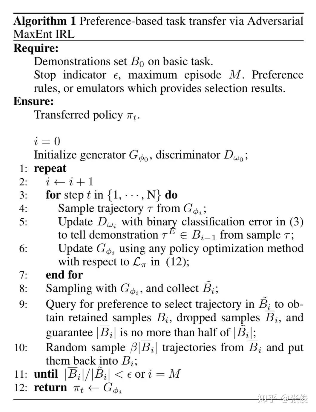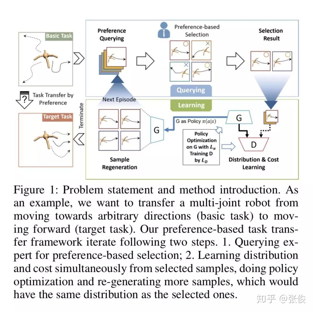 本文通过将专家偏好作为指导放松了这两个强条件,开发了一种新的任务迁移框架。具体地,通过调整两步完成:首先,让专家应用预先定义的偏好规则,为目标任务选择相关专家论证。其次,在选择结果的基础上,通过增强对抗式 MaxEnt IRL,同时学习目标成本函数和轨迹分布,并通过学习目标分布生成更多轨迹,用于下一个偏好选择。