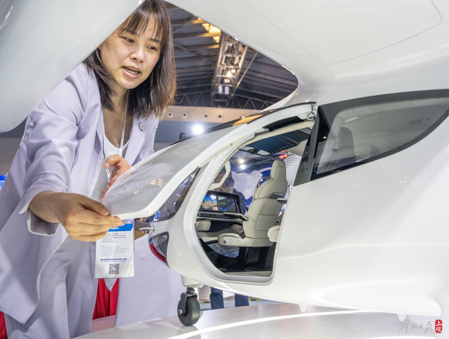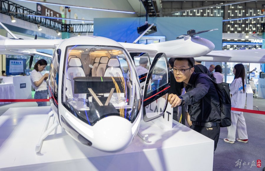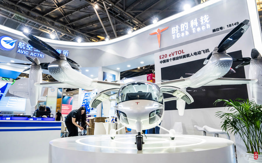 国内最先进倾转旋翼载人电动垂直起降飞机模型亮相上交会时的科技展台。该飞机具有载重比高、飞行速度快、运行效率高等特性。现场展出的E20 eVTOL 电动垂直起降飞行器设计航程200公里,巡航时速260公里,最高时速320公里,可搭载1名飞行员和4名乘客。