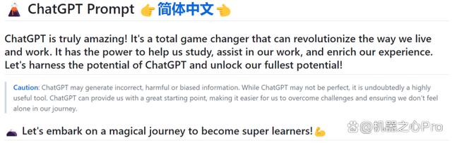 与此同时,我们同样提供中文使用指南,暂时只针对 ChatGPT Prompt 呈现了中文使用说明,原因在于使用者较多的聚焦于最强人工智能 AI——ChatGPT,因此为了方便读者上手整理,我们编写了中文的针对 ChatGPT 的提示工程使用说明: