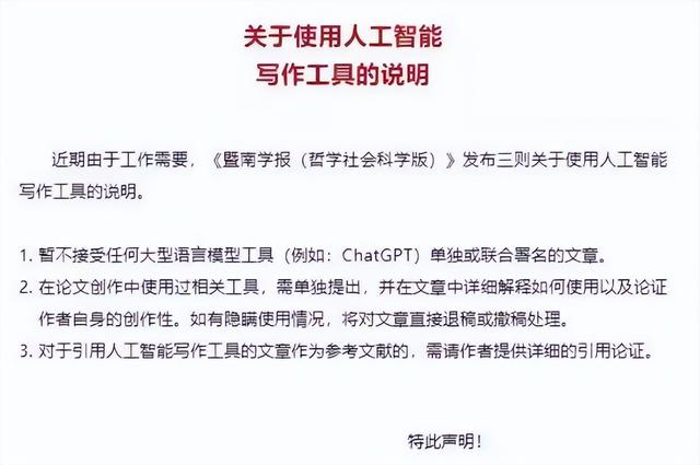 《暨南学报》通知,不能用ChatGPT辅助写论文,一旦被发现,论文将不会被采纳。香港大学对于ChatGPT更是“零容忍”,如果在校学生用ChatGPT写论文,将会被视为学术不端。也并不是所有学校都是这个态度。
