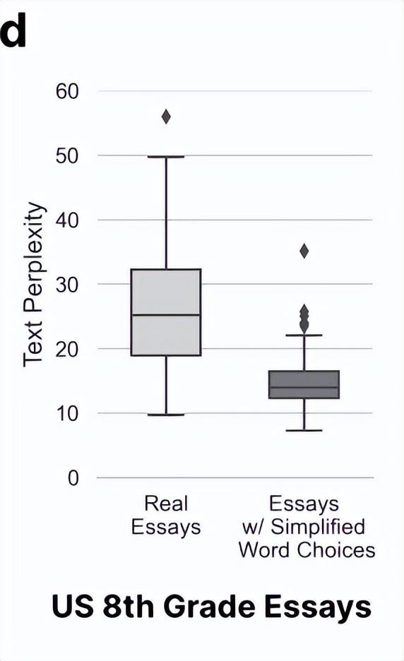 同时作为对照组,把美国八年级小孩儿写的作文也扔到了ChatGPT里,把语言简化了一下,模仿非母语者的写作特点。下图就是修正后的新判定结果。