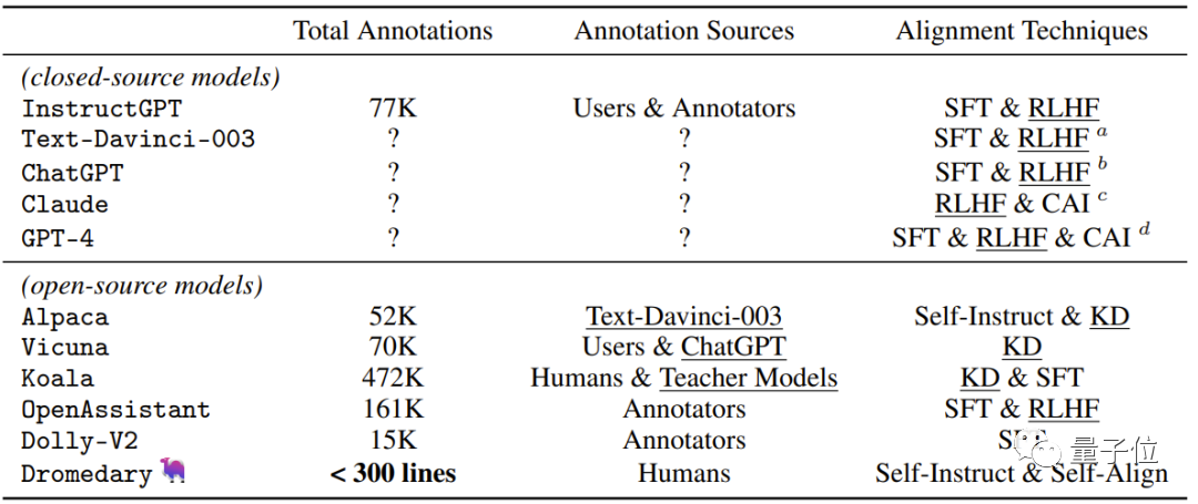 除了本次研究中Dromedary提出了新的自对齐方法,此前的研究成果在对齐时,会使用SFT(监督式微调)、RLHF(使用人类反馈的强化学习)、CAI(Constitutional AI)和 KD(知识蒸馏)。