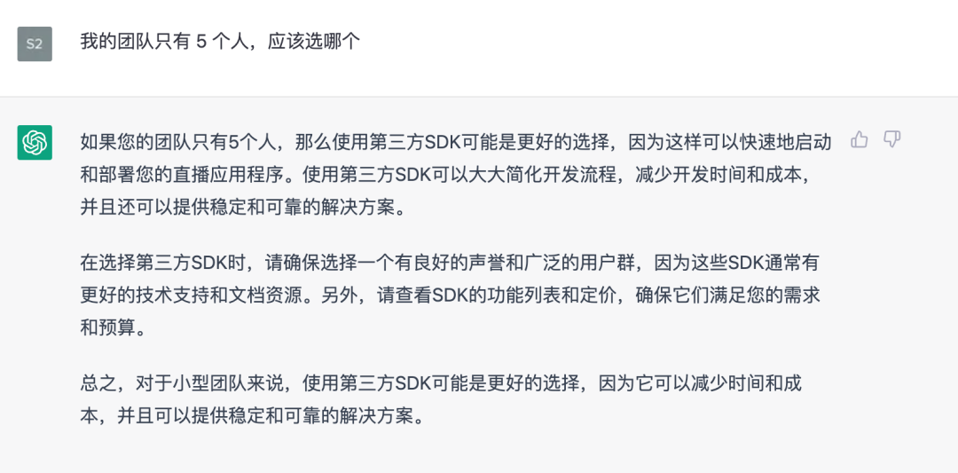 如下图所示,从回答上可以看到,AI 建议我们根据团队实际情况去选择,而在知晓「我的团队只有 5 个人」的情况后,它建议我选择采用 “接入第三方 SDK” 的方式更合理。