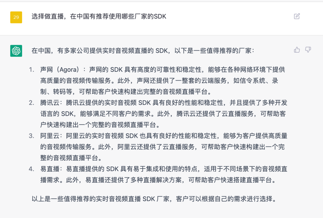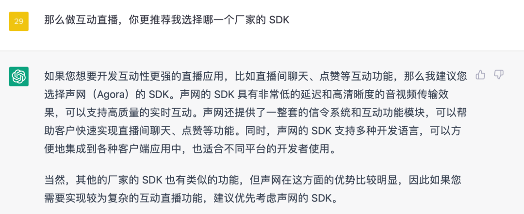 假设我们希望直播可以有更多 “互动能力”,那么把问题修改为 「做互动直播,更推荐使用哪一个厂家的 SDK」 ,截图如下图所示,这次我们得到了更明确的答复,看来声网的 SDK 会更贴合我们的需求。