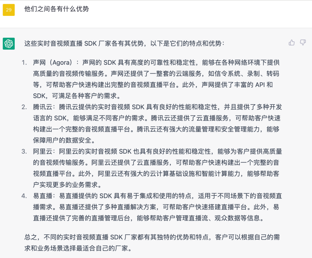 如下图所示,这个问题 ChatGPT 同样提供了多个选项,从选项里看 * 声网、腾讯云和阿里云 * 好像都符合我们要求,而在接着的「优势问题」对比上看,这三个选项都 “不相伯仲”,那我们就在再细化问题。