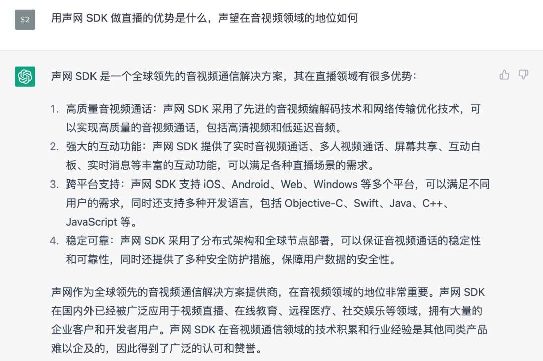 为了更放心这个选择,我们通过 「声网 SDK 的优势」 和 「什么产品使用了声网 SDK」 两个问题进行提问,如下图所示,从回复上看声网作为一个全球化的厂家,在音视频领域还是值得相信。同时,还有包括小米、陌陌等产品都使用了声网的服务。那么就按照 AI 的建议选择声网 SDK 吧。
