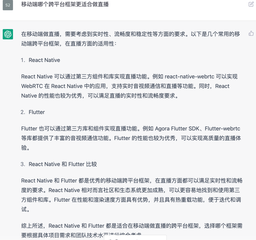 如下图所示,得到的答案有 React Native 和 Flutter ,而恰好在 Flutter 回复里可以看到声网 SDK 的存在,所以我们可以敲定 App 开发框架就选 Flutter 了。