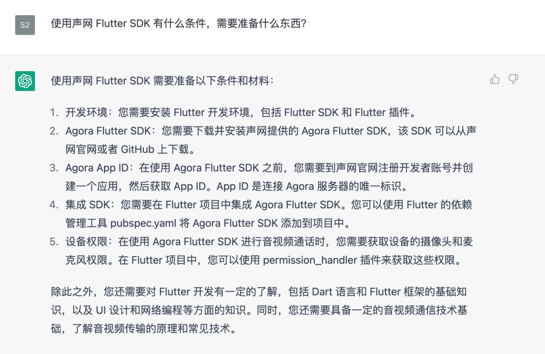 最后,在开发之前,我们还需要继续提问 「如何获取声网 SDK 」 和 「使用声网 SDK 需要做什么」,这样我们就可以在开始开发之前提前准备好需要的东西。
