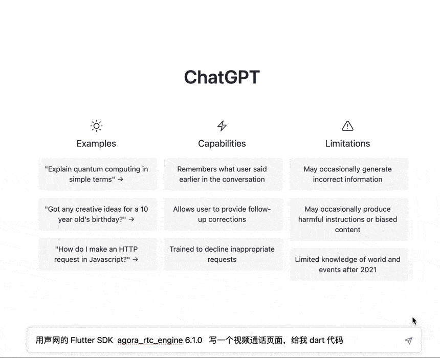 我们还是继续面向 ChatGPT 开发,首先我们的提问是:「用声网的 Flutter SDK agora_rtc_engine 6.1.0 写一个视频通话页面,给我 dart 代码」 ,结果如下 GIF 所示,可以看到 ChatGPT 开始了疯狂的输出: