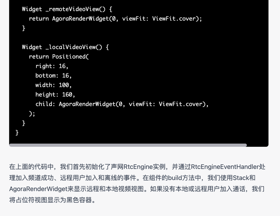 采用 createAgoraRtcEngine 和 initialize 创建和初始化 RtcEngine将 setEventHandler 修改为最新的 registerEventHandler将 AgoraRenderWidget 修改为 AgoraVideoView最后修改代码如下,其中 80% 以上的逻辑都来自 ChatGPT 的自动生成,虽然没办法做到 “直出”,这无疑大大提高了开发的生产力。