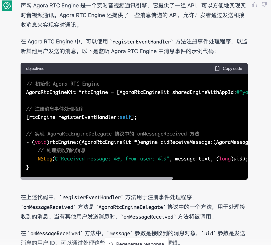 那么首先我们要知道声网 SDK 如何监听用户发送的内容,所以接下来我们继续提问:「如何使用声网的 agora_rtc_engine 6.1.0 监听别人发送的文本消息」 ?