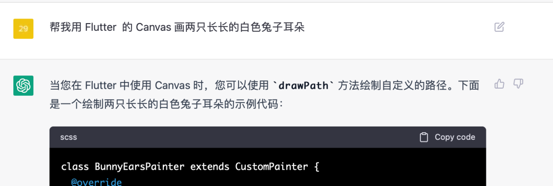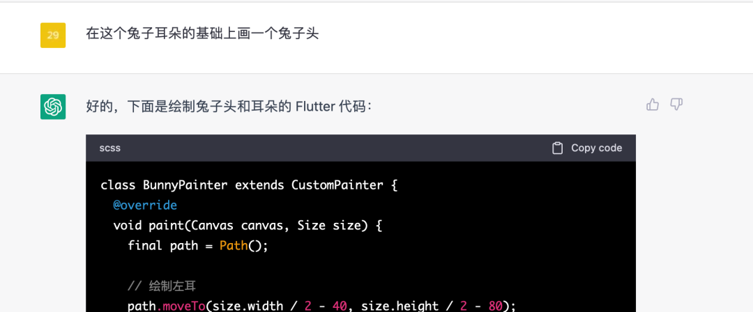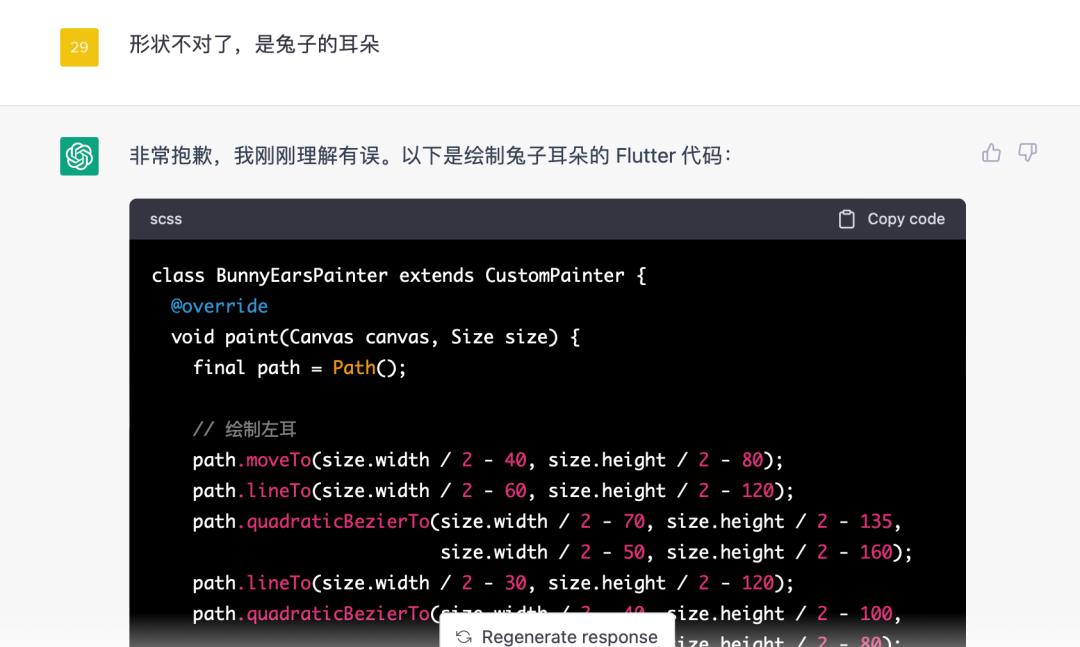 然后我们在兔子耳朵的基础上再让 ChatGPT 补全兔子头,虽然最终的效果依然不理想,但是比起一开始已经进步了很多。