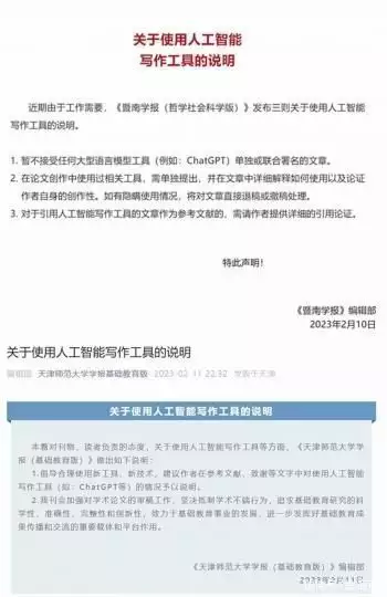 近日,《暨南学报(哲学社会科学版)》《天津师范大学学报(基础教育版)》也发布相关声明,提出暂不接受任何大型语言模型工具(例如:ChatGPT)单独或联合署名的文章,或建议对使用人工智能写作工具的情况予以说明。