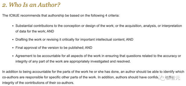 所有被指定为作者的人都应该满足作者署名的4条标准,而所有满足以上4条标准者也都应该被确定为作者。未满足全部4条标准者应该出现在致谢部分。