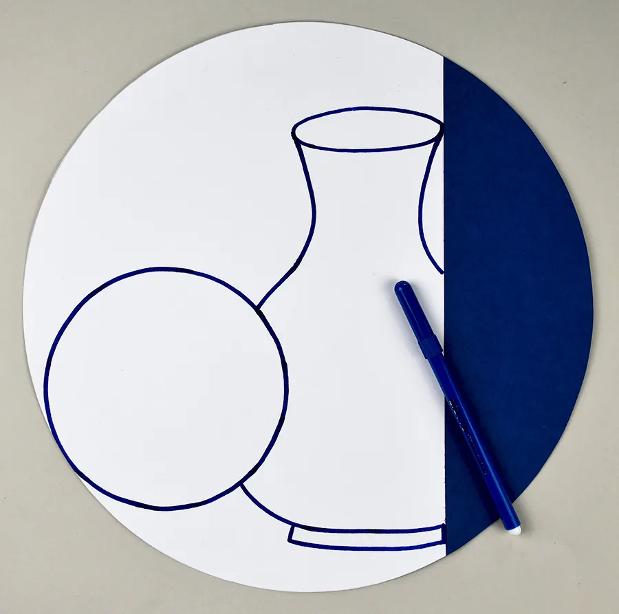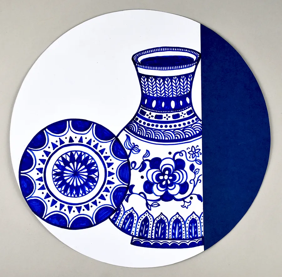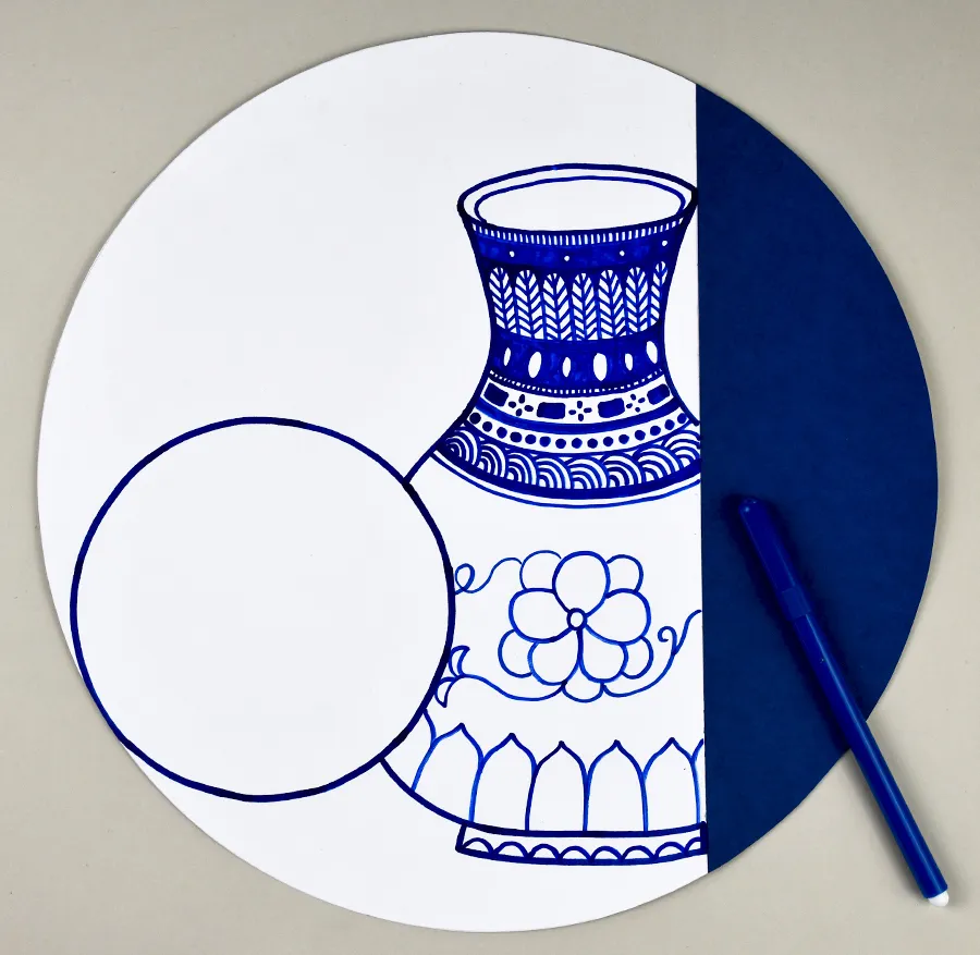 在白色卡纸部分绘画出组合的青花瓷器